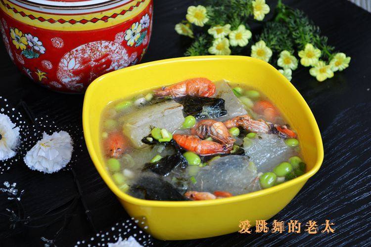 冬瓜600克;毛豆子100克;河虾100克;紫菜适量;