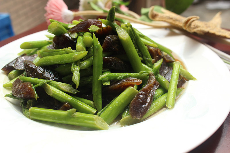 7:炒到锅中油清亮后放入芦笋翻炒,稍稍加点点清水,稍翻炒2-3分钟即可,起锅前滴入少量醋。