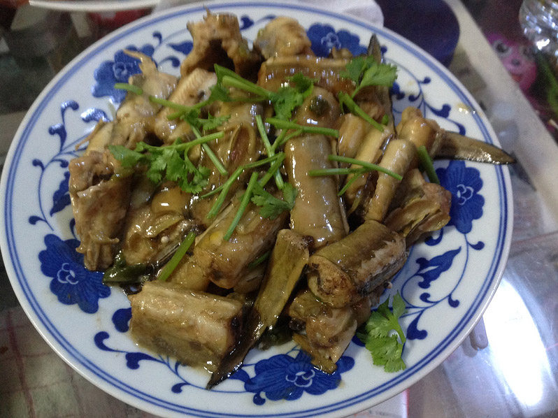 9:出来葱姜的香味以后,倒入切好的鳗鱼。加入老抽,料酒,盐,翻炒。