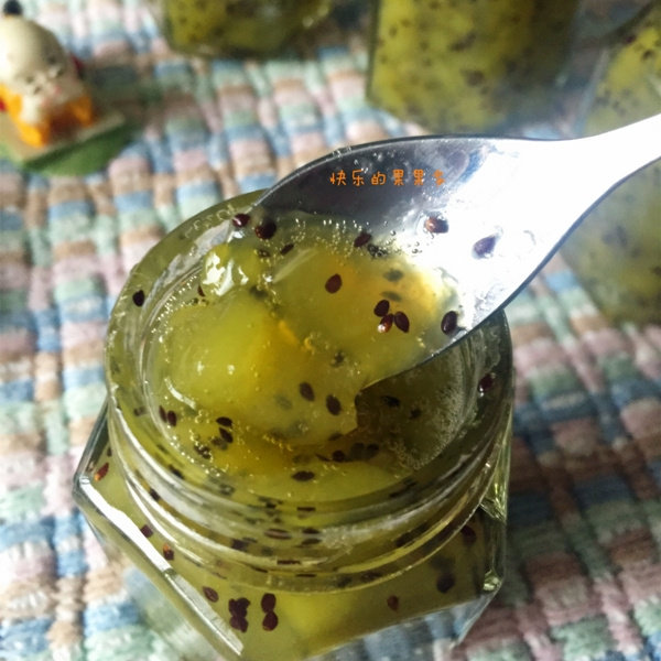10:趁热将果酱装进果酱瓶内(果酱瓶提前洗净并用沸水蒸煮消毒30分钟,捞出沥干备用),盖紧瓶盖后趁热倒扣;倒扣30分钟后洗净瓶身,置于室温3~7天再放进冰箱中冷藏;