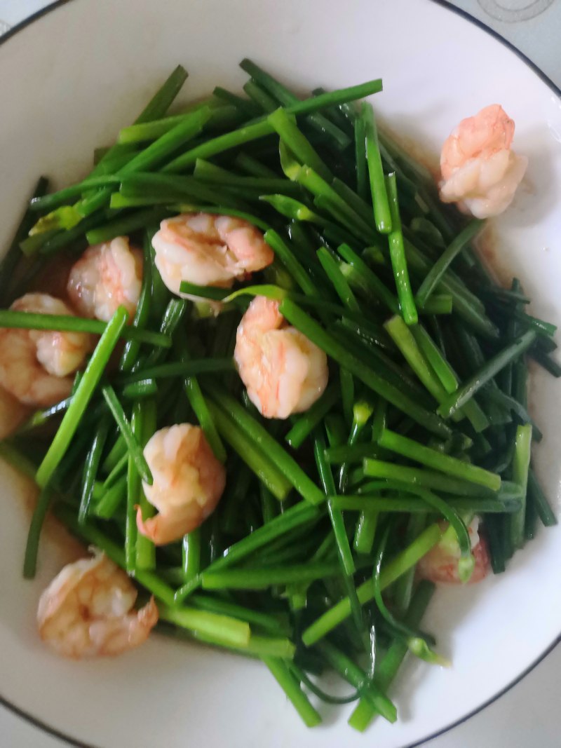10:迅速将韭菜和河虾炒匀后出锅。