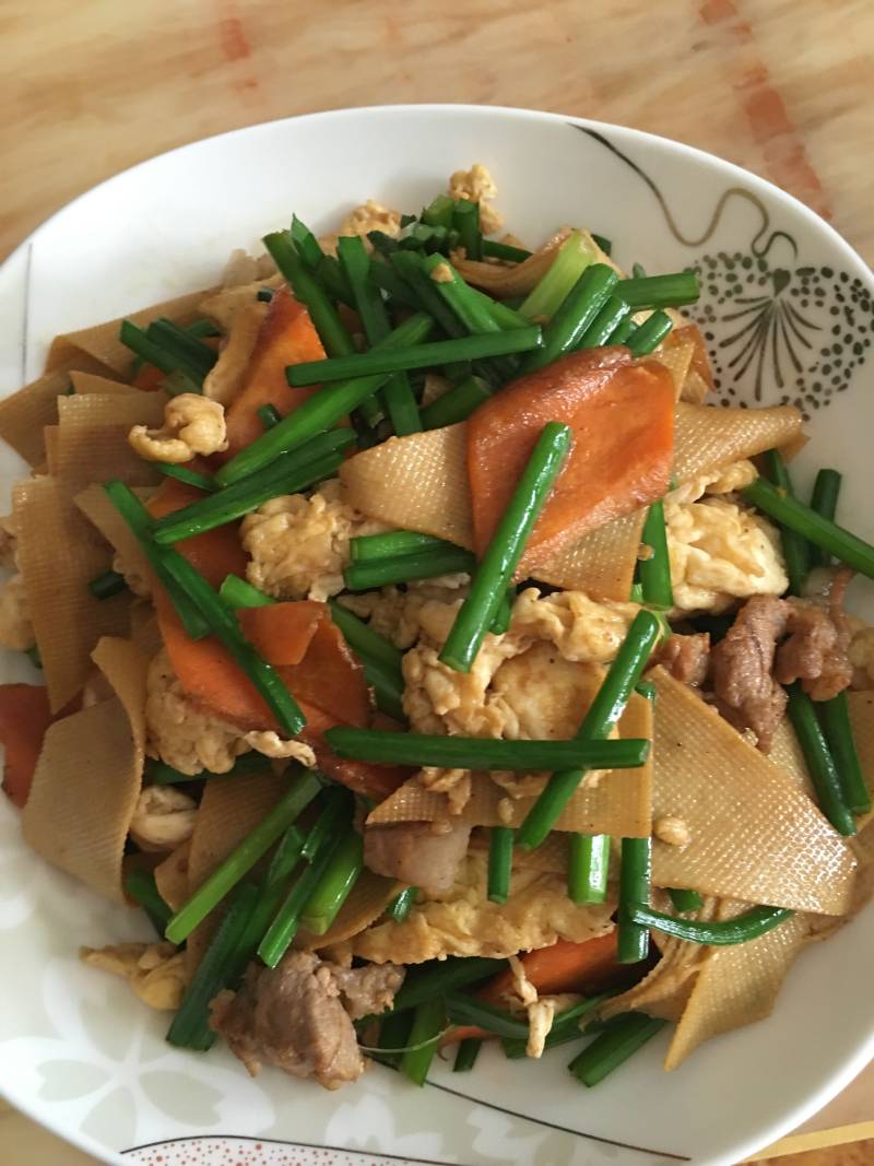 3:油锅烧热油倒入肉片翻炒片刻倒入胡萝卜片翻炒,放酱油和料酒,依次放入干豆腐和韭菜苔鸡蛋翻炒片刻放一即可