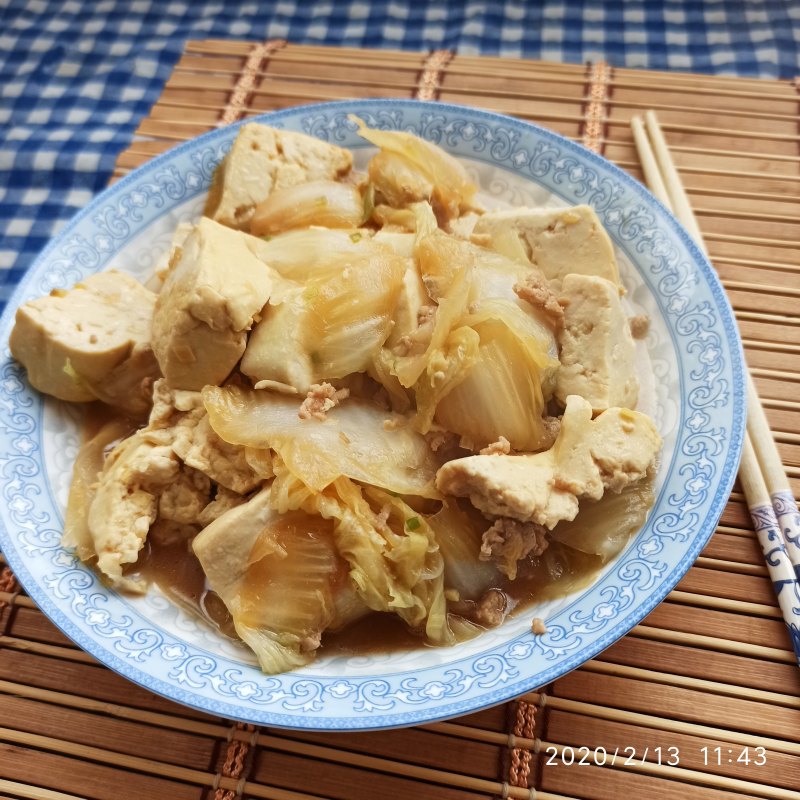 3:热锅凉油,葱姜末爆香,煸炒猪肉末再下入焯好的白菜,最上面将焯水后的豆腐均匀摊铺在白菜上面。出锅前撒入鸡精翻炒几下即可。