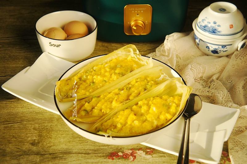 6:玉米叶子洗净,取两个玉米叶,叠放在一起,用勺子舀入拌好的玉米羹放在玉米叶上面。