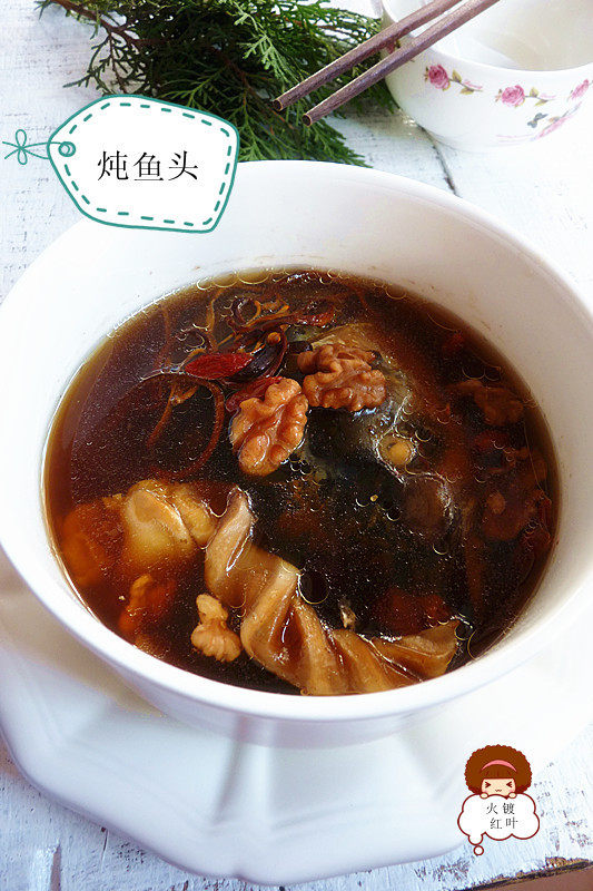 鱼头半个;鱼膘1个;枸杞子3克;虫草花2克;核桃仁5克;红枣3个;温开水1.5碗;姜3片;