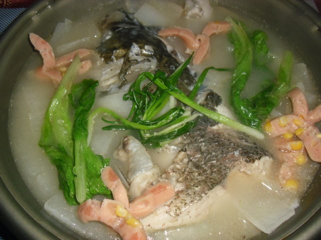 白萝卜适量;胖头鱼鱼头适量;玉米肠适量;生菜适量;葱适量;姜适量;