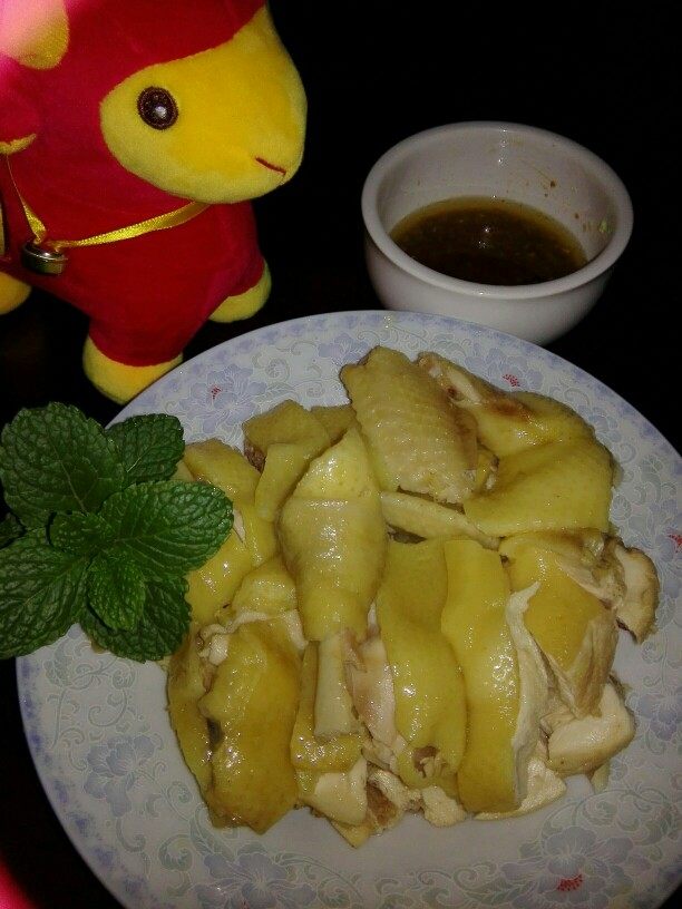 切记要掏干净鸡腹腔内靠背部位置的那块淤血,也叫肺。不掏干净肺部容易蒸不熟,也不卫生。蒸好时,不确定是否熟透,建议用筷子轻轻捅一下鸡的后背,肋排位置,能不费力地捅穿后背进入肚子,拔出来没有血水,只冒出一丝的油水,且鸡皮紧绷呈油黄发亮时,就可以起锅了。稍放凉片刻切块即可。蘸料也可以蒜蓉加香菜调配,按个人喜欢吧,可以调好几种蘸料供大家选择~~