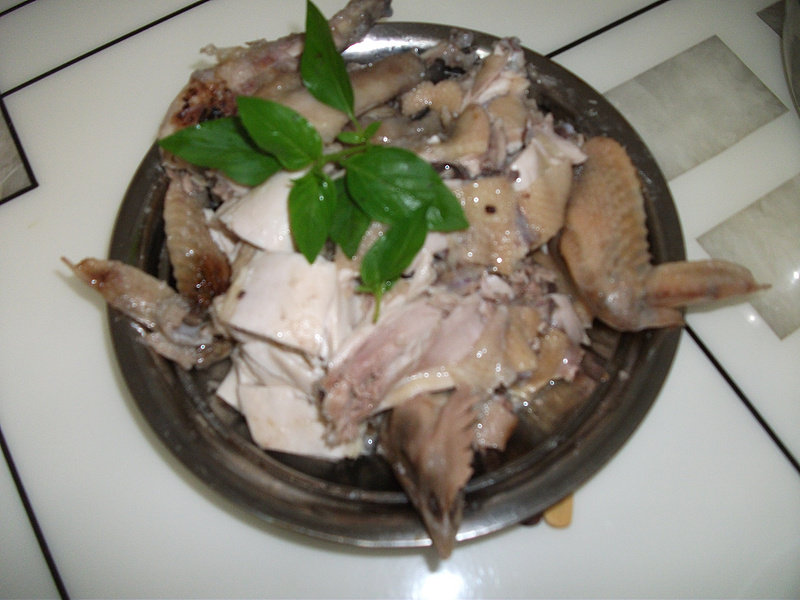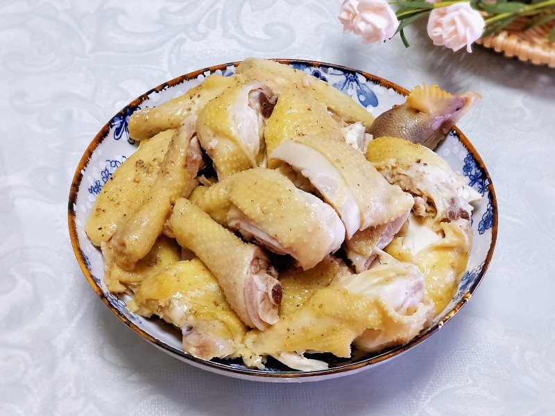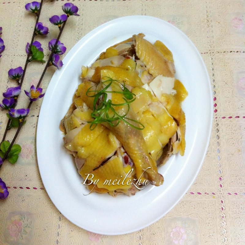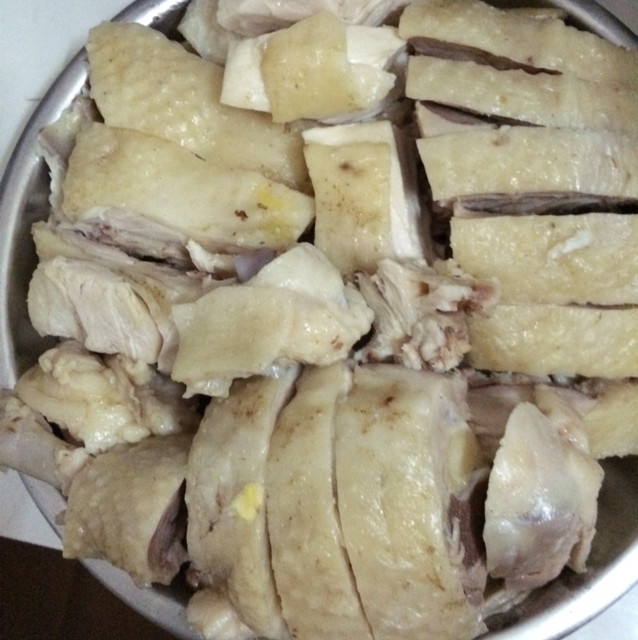 6:蒸好后取出整只鸡,腹内的姜片、葱结丢弃,斩件摆盆。(另一半趁热撒下盐粉,涂抹全身,腌制1—2两天后可以煲咸鸡粥或做客家咸鸡。)