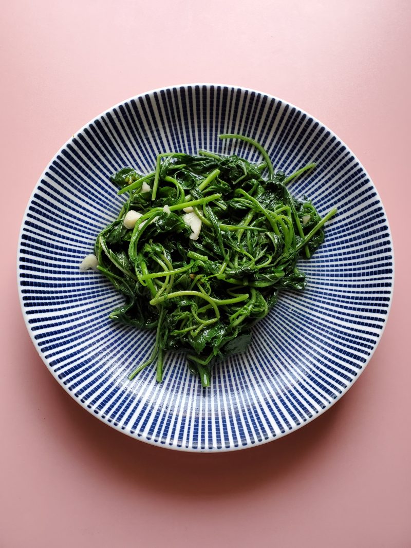 4:下白花菜大火翻炒一会,至断生,调少许盐,糖炒匀即可装碟(白花菜有点点苦味,下点糖,口感好些)