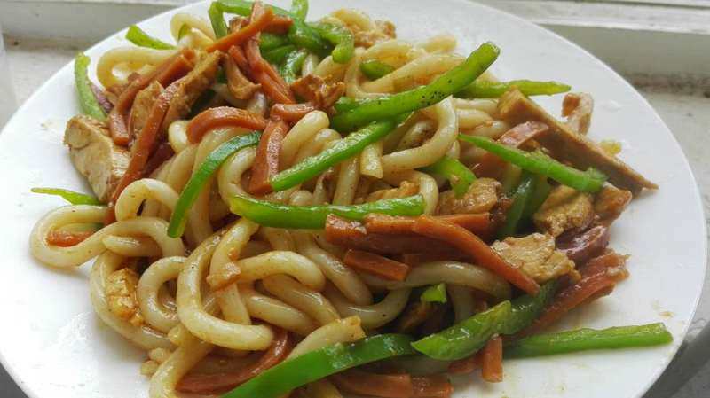 鸡胸肉100g;青椒半个;火腿肠一条;乌冬面一袋;
