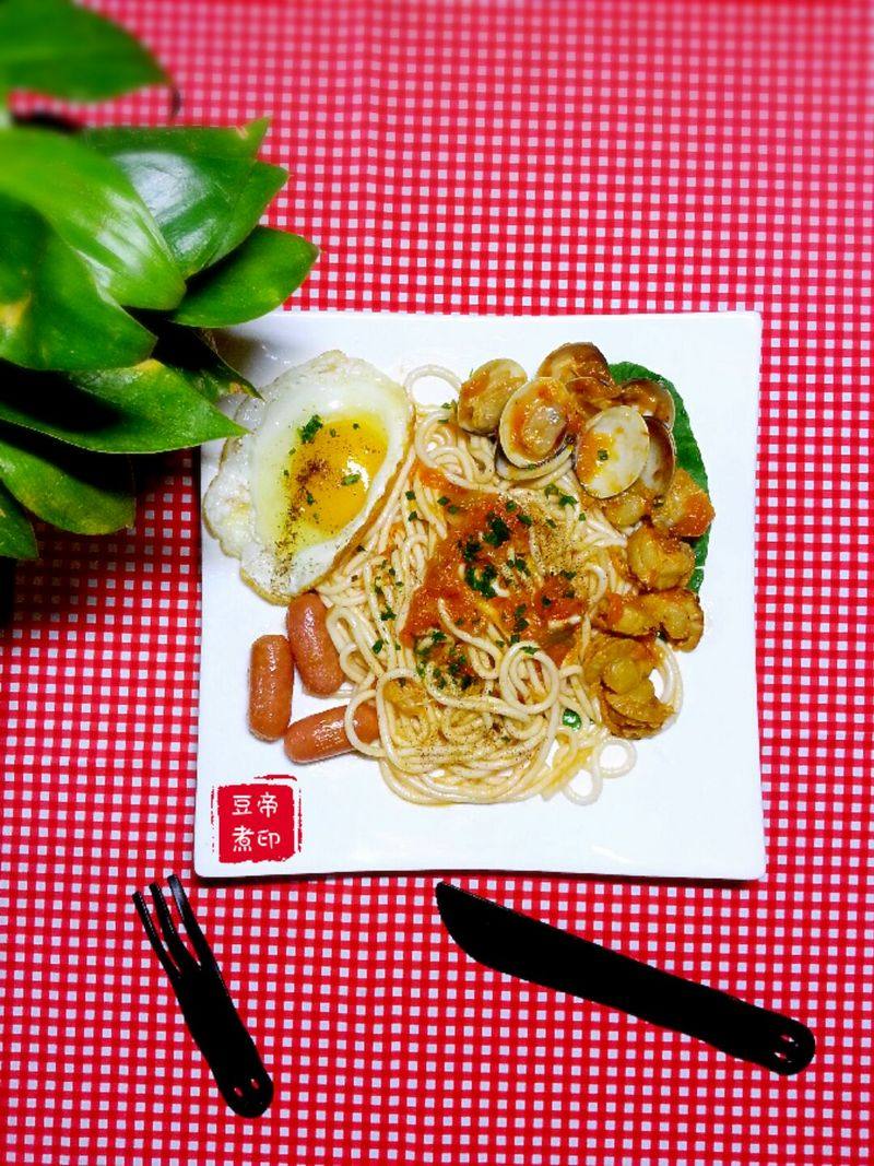 乌冬面一包;扇贝肉八个;蛤蜊五个;鸡蛋一个;西红柿一个;小巧香肠三个;