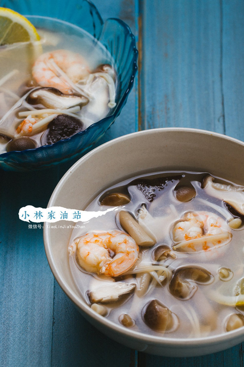 4:3.将水倒入小锅里,煮滚后加入处理过的菌菇及鲜虾、以及柠檬片,再以中火煮熟。