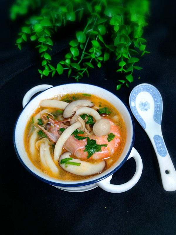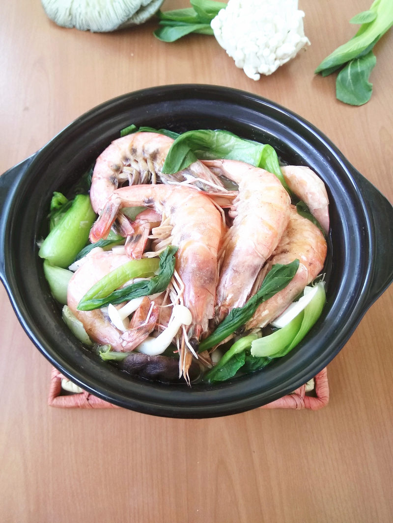 鲜虾400g;杏鲍菇150g;白玉菇100g;平菇150g;香菇100g;莲藕100g;油菜80g;