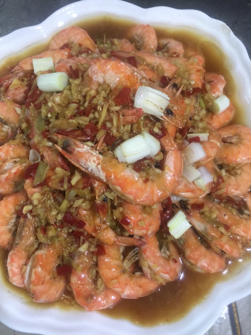14:趁油热把姜蒜葱末油浇到大虾上,再洒些新鲜的小葱和小辣椒末(不吃辣可以不洒)装饰一下