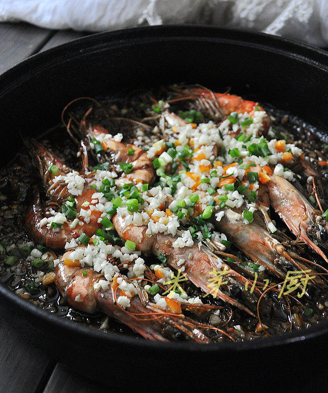 3:开小火,盖上锅盖,煎约3分钟左右(看各家炉子的活力情况掌握实际操作时间),給虾翻个面,再撒蒜蓉,继续煎3分钟左右,撒上葱花即可。