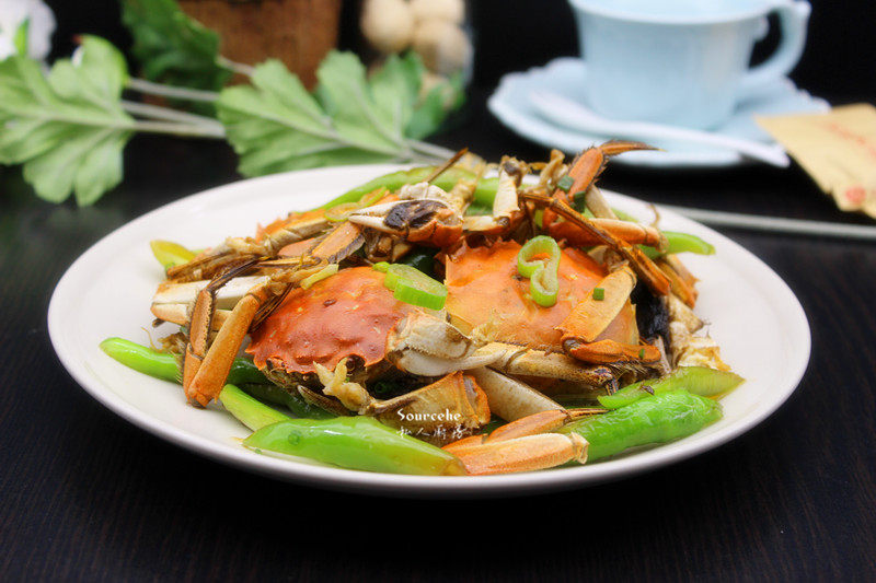 6:把切好的大闸蟹加入、生姜、紫苏放入翻炒,然后再放蟹醋、生抽;