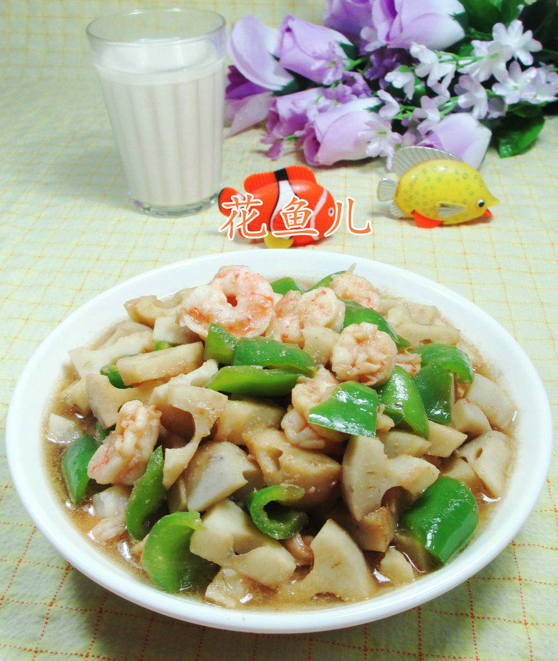 1:食材:虾仁(已清洗)、莲藕(已清洗去皮切开)、尖椒(已清洗切开)