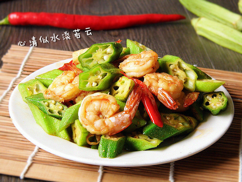 1:准备材料:秋葵200克,鲜虾200克,虾洗净后用剪刀从背部把壳剪开,从中间剔除虾线,剥下虾皮保留虾肉