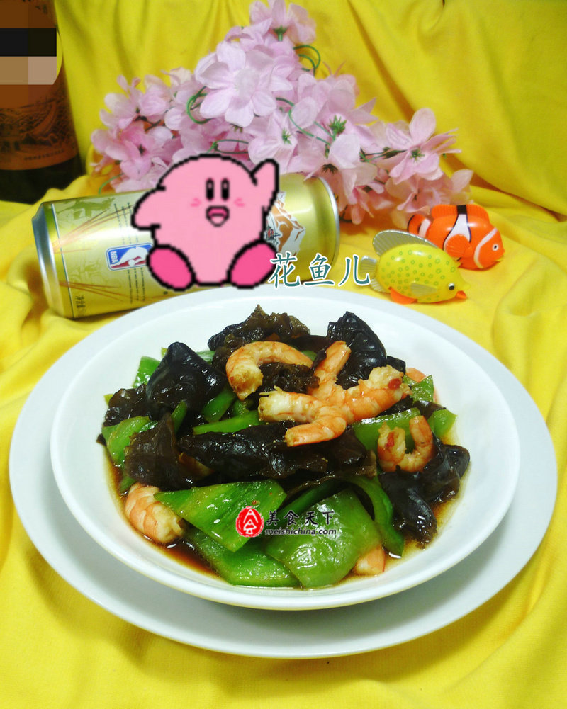 1:食材:白灼虾、黑木耳(已泡发清洗)、尖椒(已清洗切开)