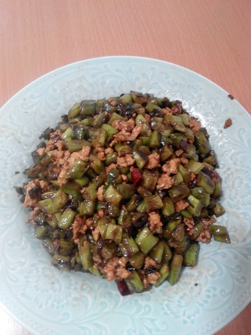12:带肉末差不多熟了,倒入煸好的四季豆,继续翻炒。