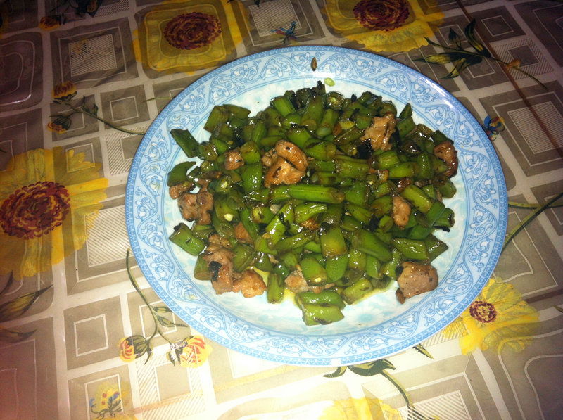 4:倒入五花肉,煸炒出油,然后加入四季豆,煸炒,依次放入生抽,少许白糖,然后一大汤匙的橄榄菜,不用放盐,因为橄榄菜比较咸,翻炒均匀