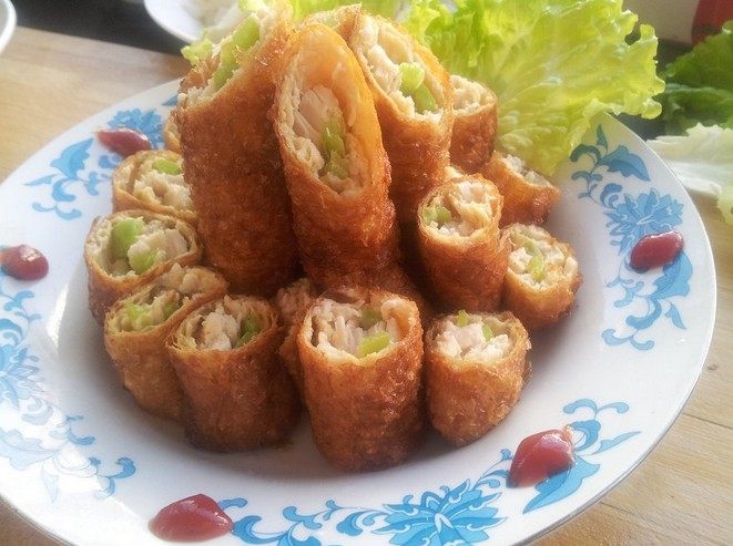 8:锅中倒油烧热,下入腐皮肉卷,中小火炸。