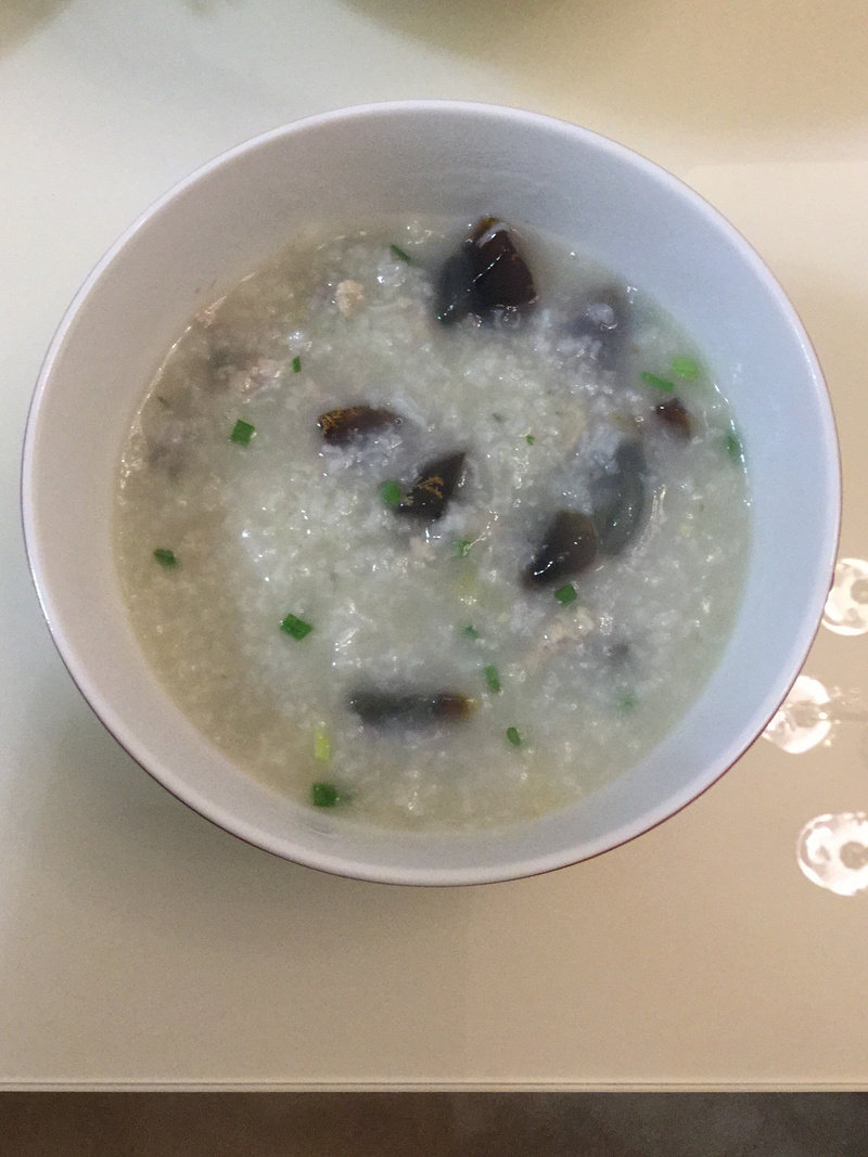 猪肉50g;皮蛋1个;米粥1斤;