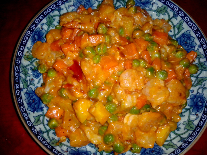 7:国内加入胡萝卜丁、豌豆和菠萝丁翻炒均匀。