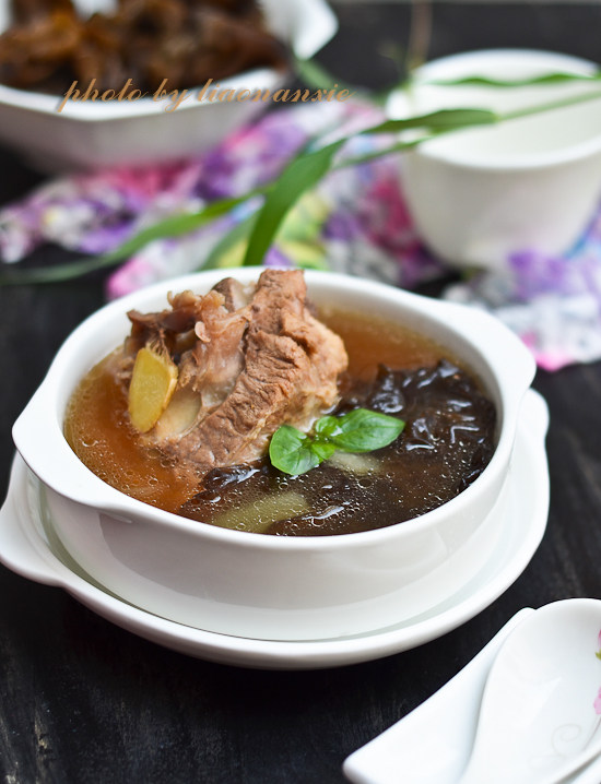 8:汤锅里重新加水,煮开后放入事先清理好的骨头,加入两截葱段、两片姜、炖料包,少量料酒中火炖煮两个小时。当肉酥烂后,加入酱油调色,放食盐、鸡精调味,加入炸豆腐、蘑菇、撕开的银耳,再放入适量食油炖煮十分钟,最后加入油菜,煮五分钟,即可出锅啦!(雾气大,照片略微模糊。)