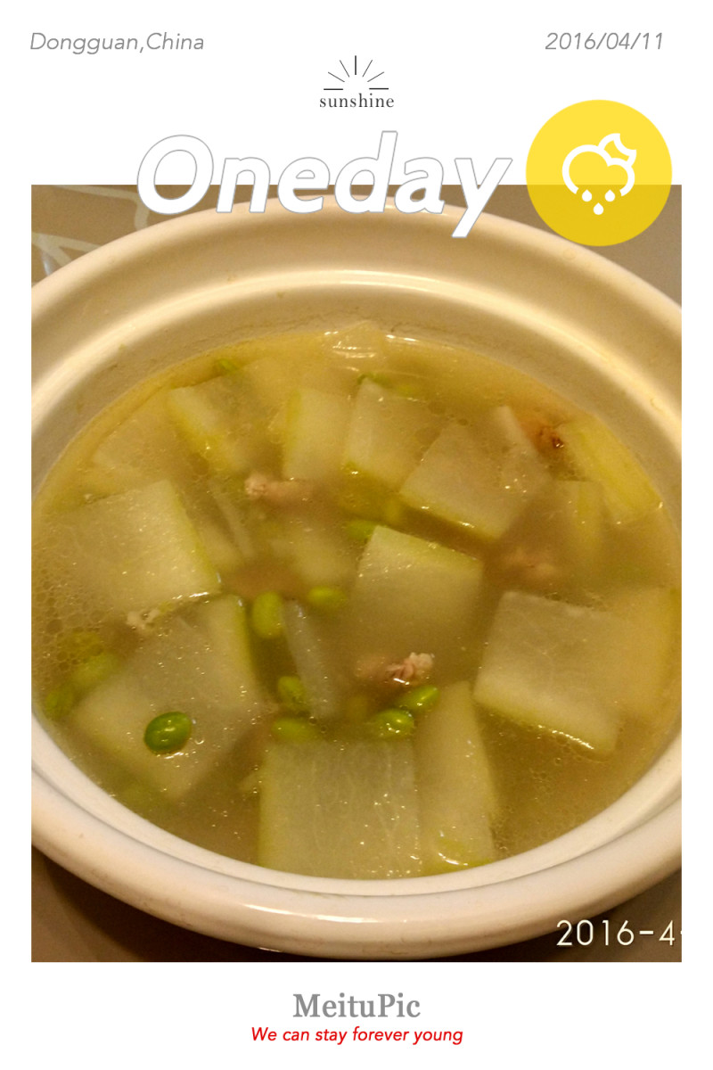 1:冬瓜去皮切块,瘦肉切薄片,青豆洗净,姜切片。