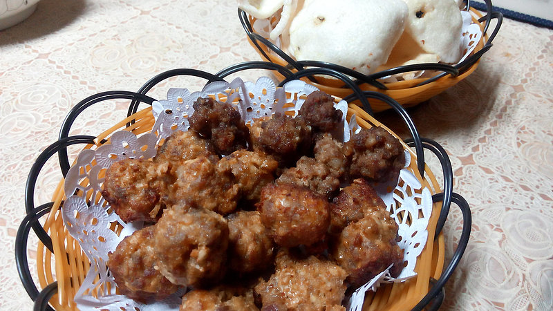 7:这个量刚好能做一小盘,稍远点的那几个颜色较深的是纯肉的肉丸子,方法如下,