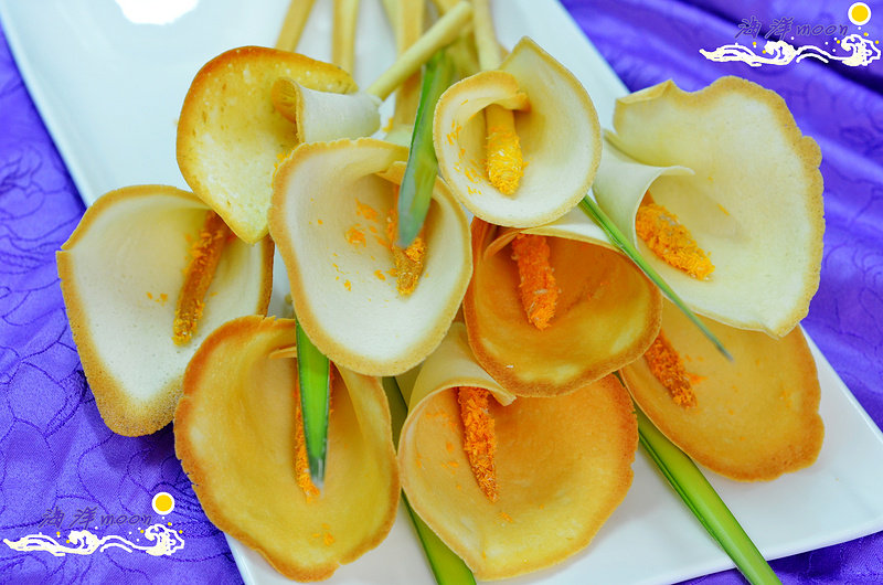 15:蛋白饼干烤好以后取出,立即用刮刀或者铲子铲起,趁热迅速包住花芯,冷却后即可食用。(这一步要求速度一定要快,不然蛋白饼干就脆了无法包花蕊了,所以没拍下来这一步。)