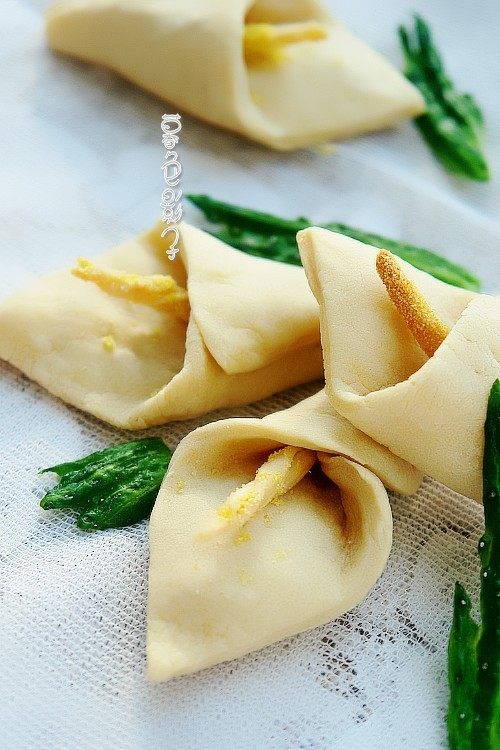 8:把韭菜苔放在中间,然后2个角捏紧,把韭菜苔裹住