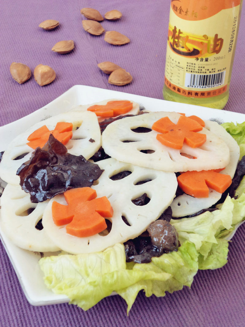 3:木耳浸泡好撕成小朵。胡萝卜洗干净切成花片。