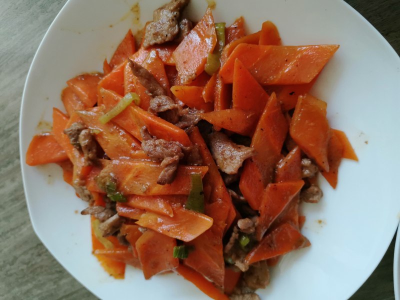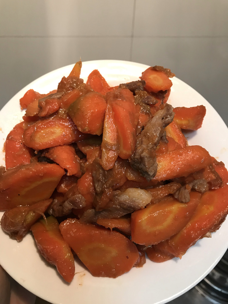 3:翻炒一下,加适量水加盖焖煮至5-10分钟,胡萝卜软一点,加入盐和适量酱油即可。
