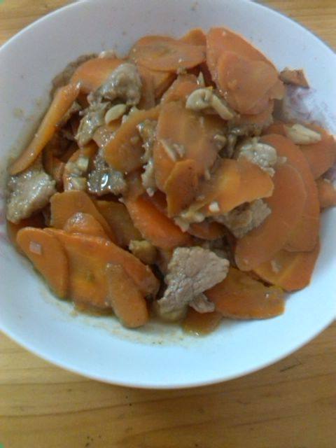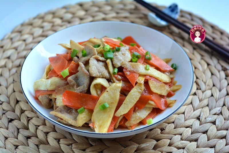 4:热锅凉油,肉片煸炒变色加胡萝卜煸炒变软。