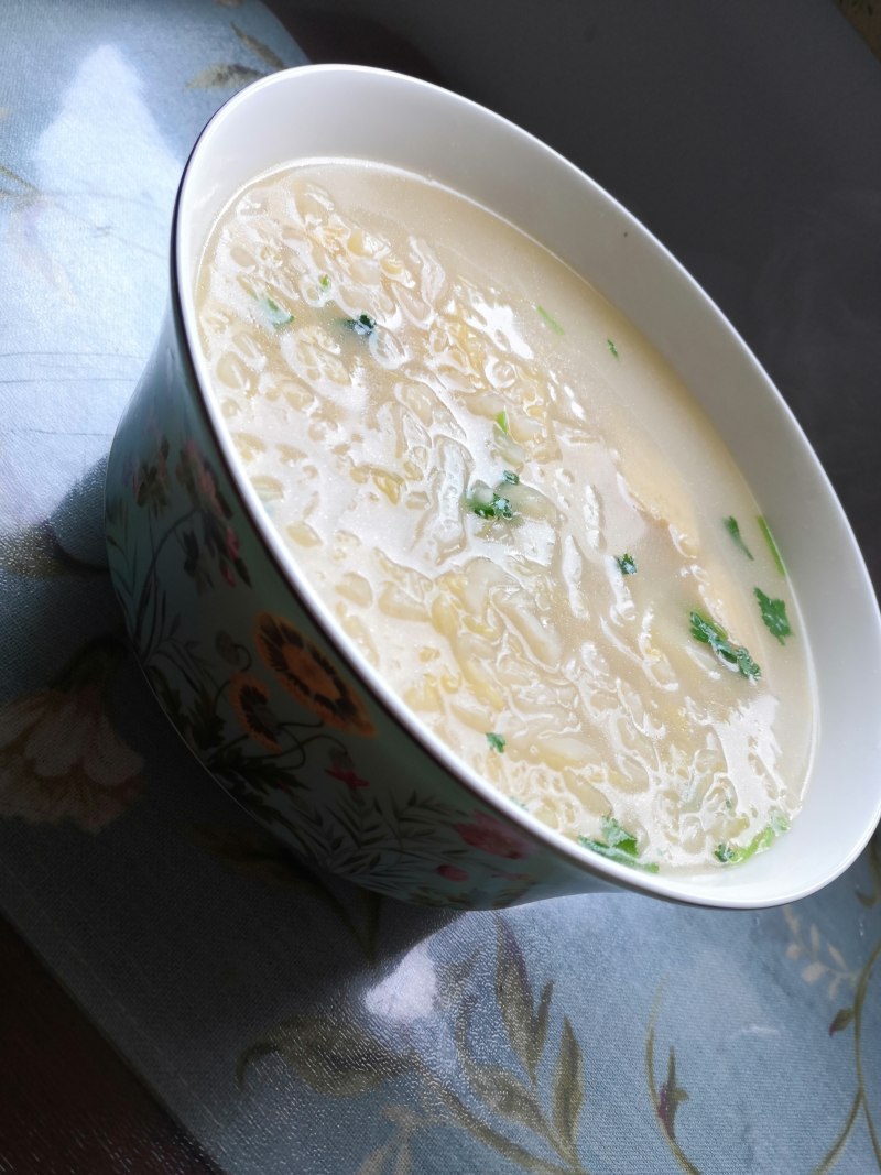 4:煮好后放入香菜沫,白胡椒粉,香油搅拌一下出锅。