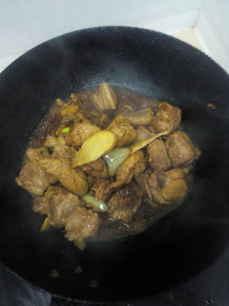 3:加水没过排骨,加老抽,八角,料酒,十三香粉,白糖,大火烧开