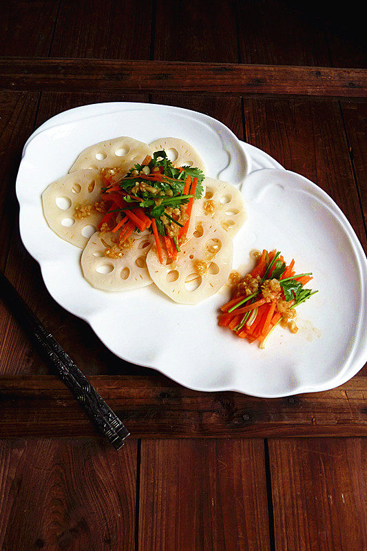 5:取一碟子,放好藕片、红萝卜丝、香菜段