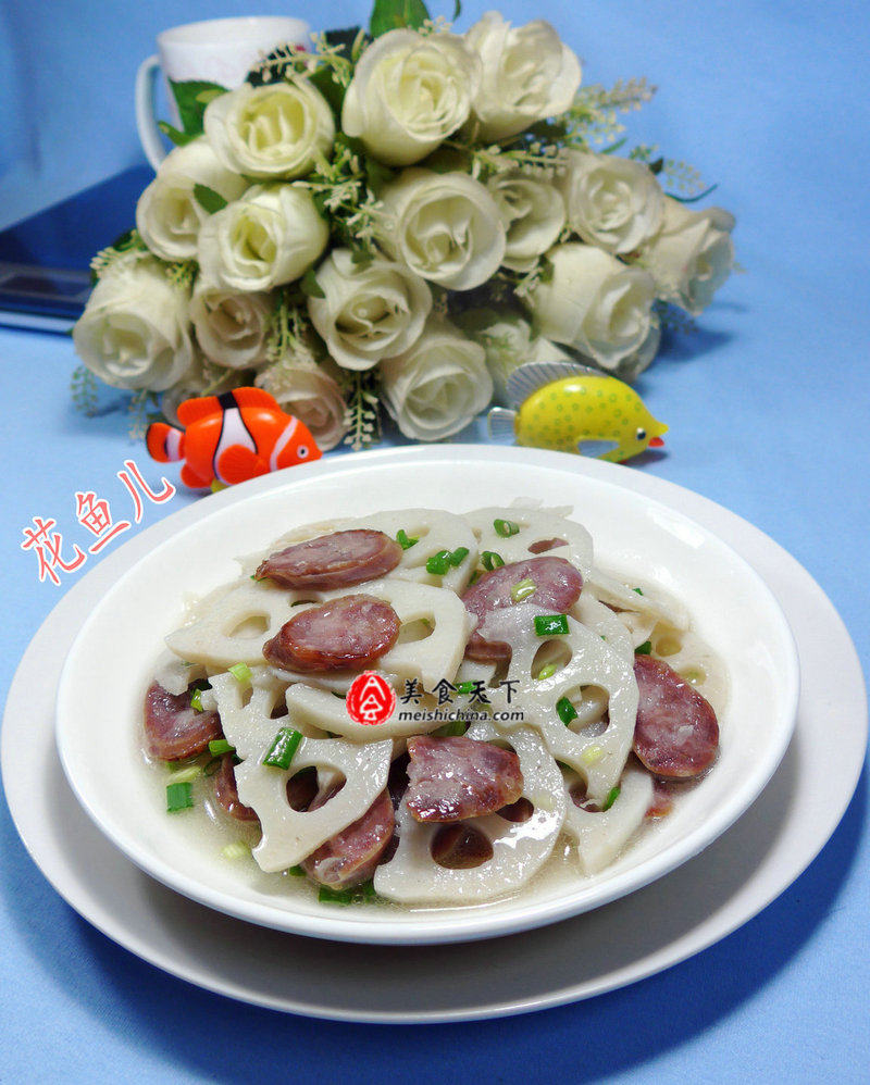 1:食材:莲藕(已清洗切片)、香肠(已切成片)、葱花