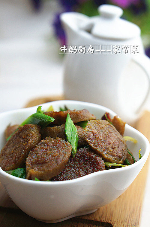 3:锅内油热,倒入蒜味肠煸炒至出香味,肠片略微卷曲.