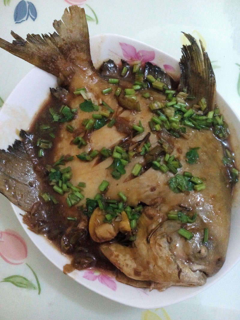 7:两侧都已入味后,大火收汁,再红烧汁已粘稠后,装盘,撒香菜碎