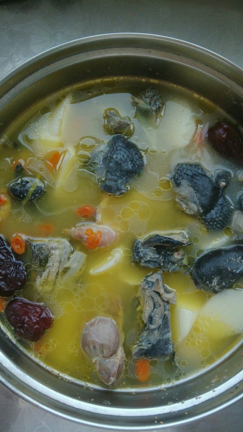 1:淮山、枸杞子洗净。乌鸡去皮清洗干净,斩块,飞水。花胶去腥处理。(之前食谱有介绍)