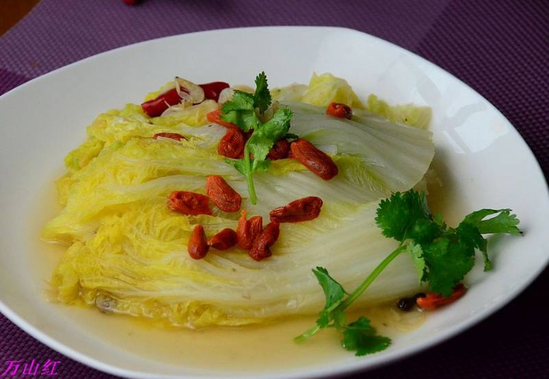 3:把白菜切段放入高汤中,枸杞清洗一下放入