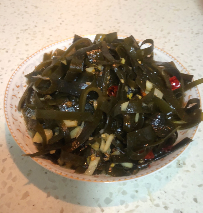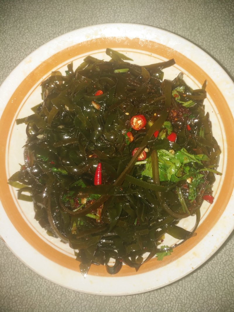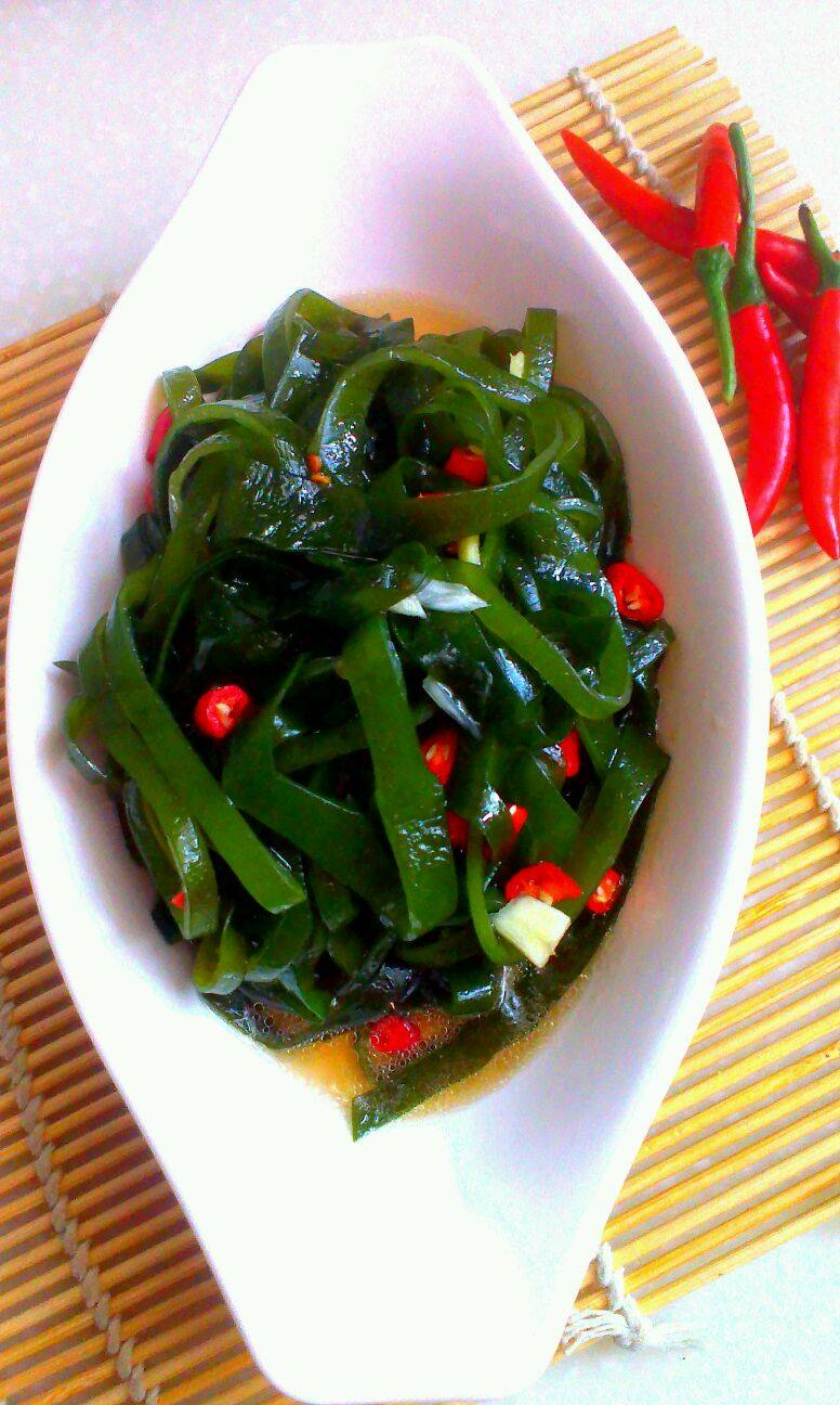 6:凉拌海带丝就做好了!辣椒放多少根据个人口味。喜欢吃香菜的,在出锅前放点香菜,闻起来香香的,颜色也更好看哦!