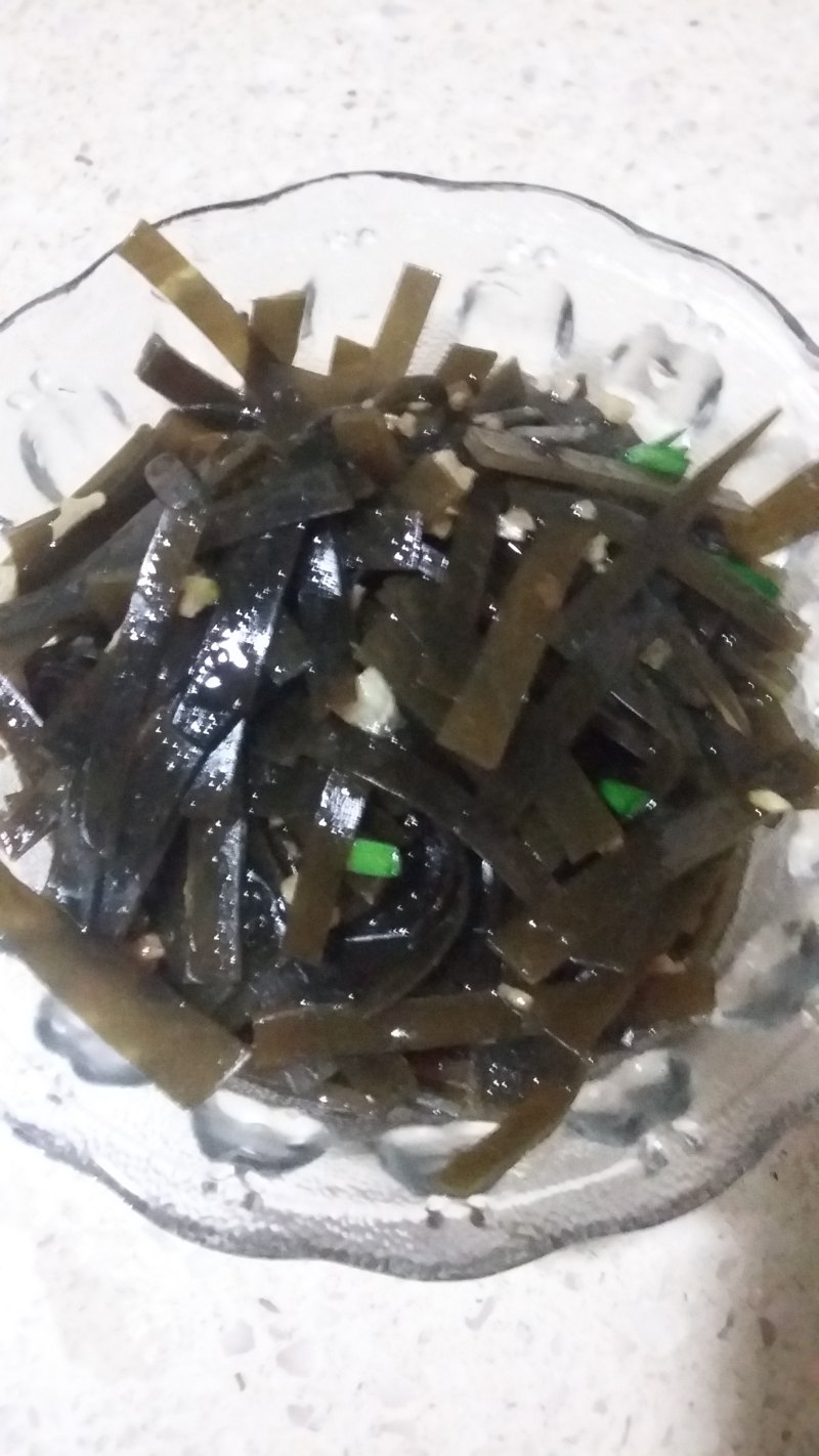 7:滴几滴香油把酱汁和海带拌匀(香油是不能加热的哦,加热后就不香了),最后撒上葱花点缀增香。