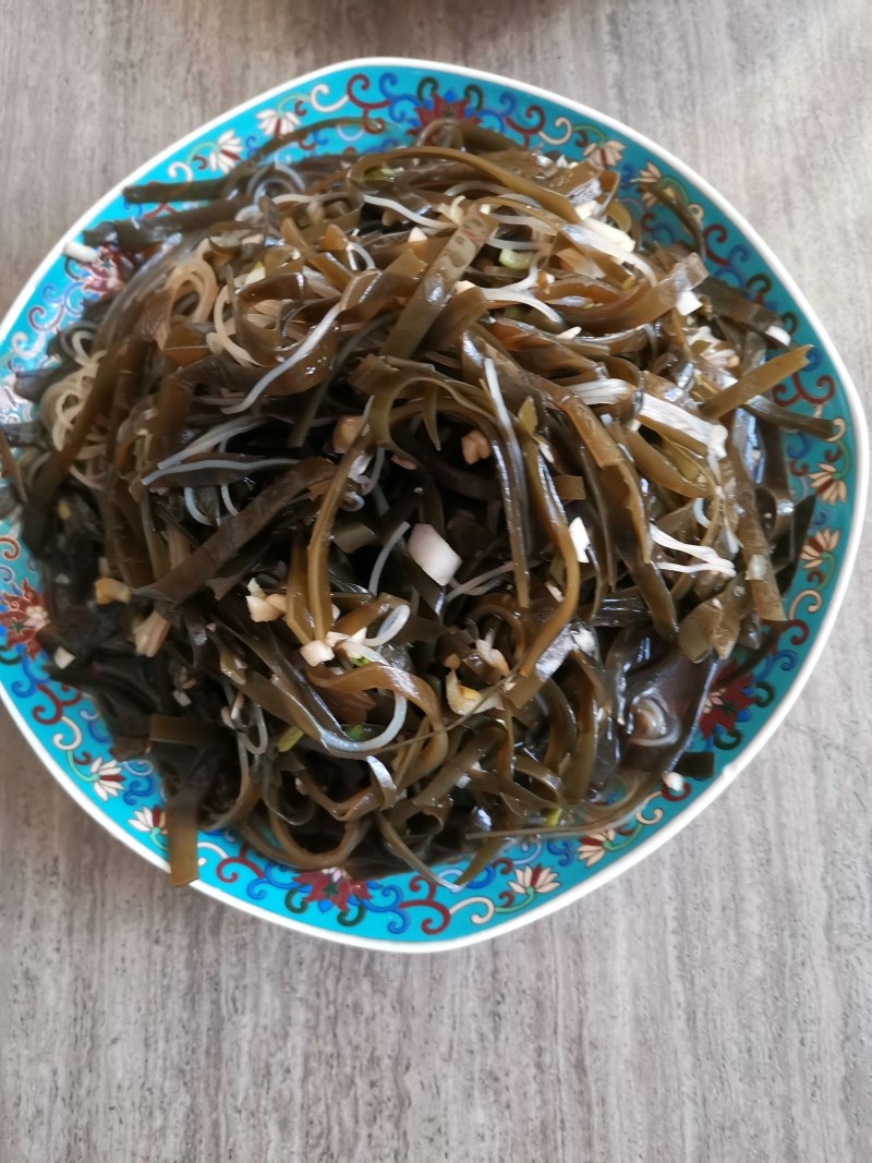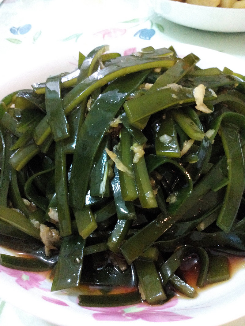 1:干海带当水里泡着,大概泡一个小时吧,具体没看,反正泡到舒展开来。