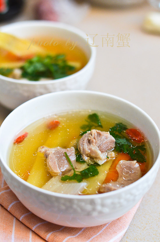 羊肉500克;胡萝卜两个;甘蔗一段;葱姜适量;枸杞子适量;香菜适量;