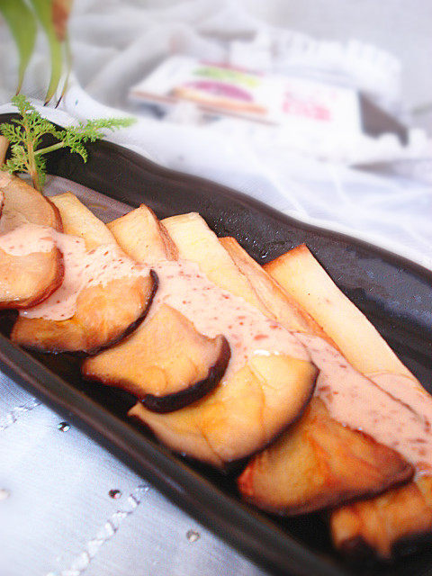 5:杏鲍菇煎至透明,颜色金黄后盛出,淋沙拉汁。