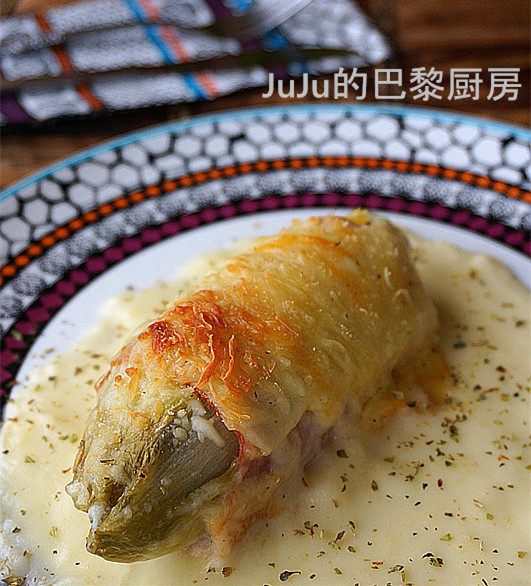 7:再倒入白汁,让苦苣火腿卷的3分之2以上浸在白汁里,(juju因为分两盘烤,导致白汁不够,没能浸满3分之2,发现有点影点影响口感)上面再撒上剩下的40g奶酪碎,放进预热到180度的烤箱烤20分钟即完成。